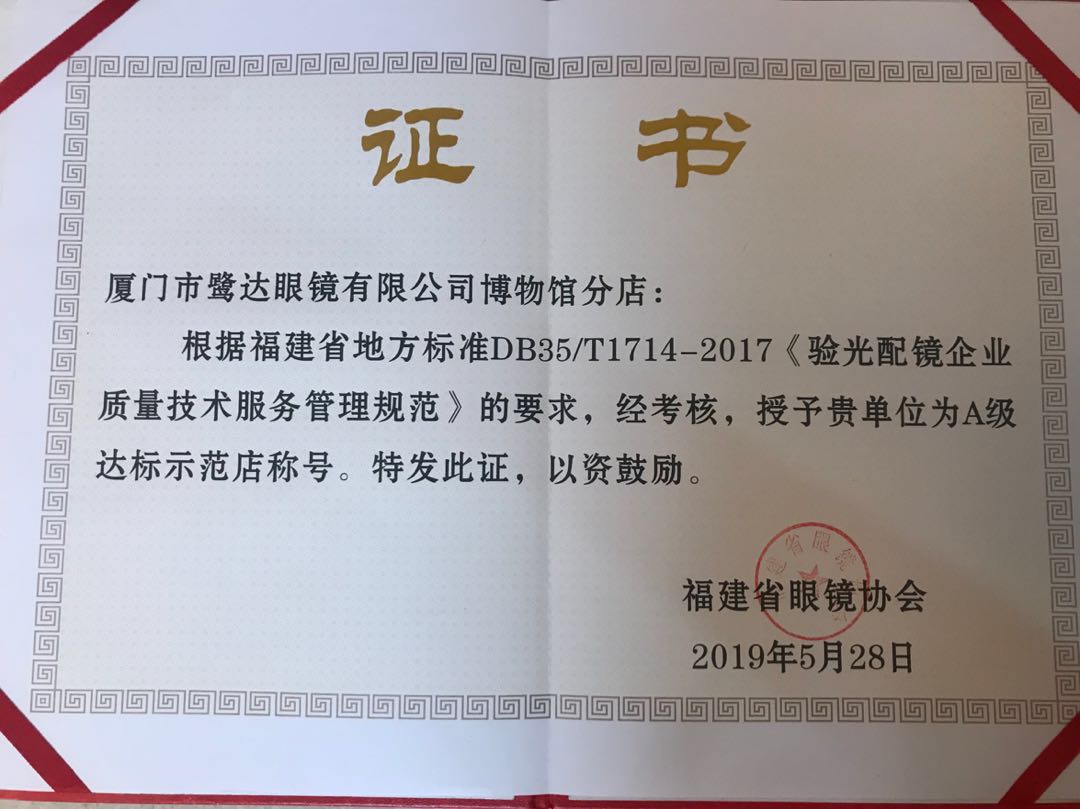 喜报!恭喜鹭达眼镜博物馆分店荣获A级达标示范店称号