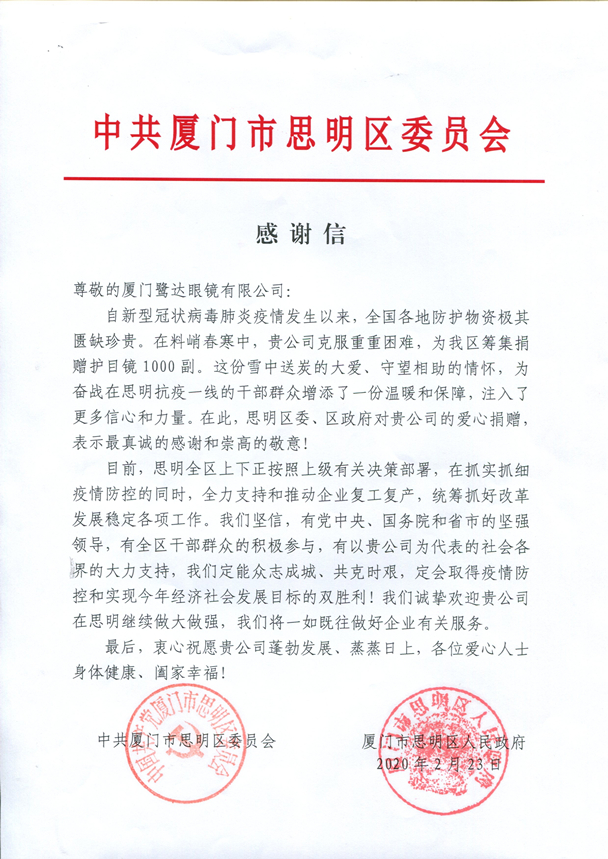 2020年04月10日,思明区委常委、统战部部长金季昆和思明区侨联主席苏枫红一行莅临我司,对我司在疫情期间,克服重重困难为奋战在一线的工作人员捐赠抗疫爱心物资表示衷心感谢,中共厦门市思明区委员会、厦门市思明区人民政府、厦门市思明归国华侨联合会发来感谢信表彰鹭达董事长张和辉。鹭达眼镜董事长张和辉、总经理朱小波热情接待。