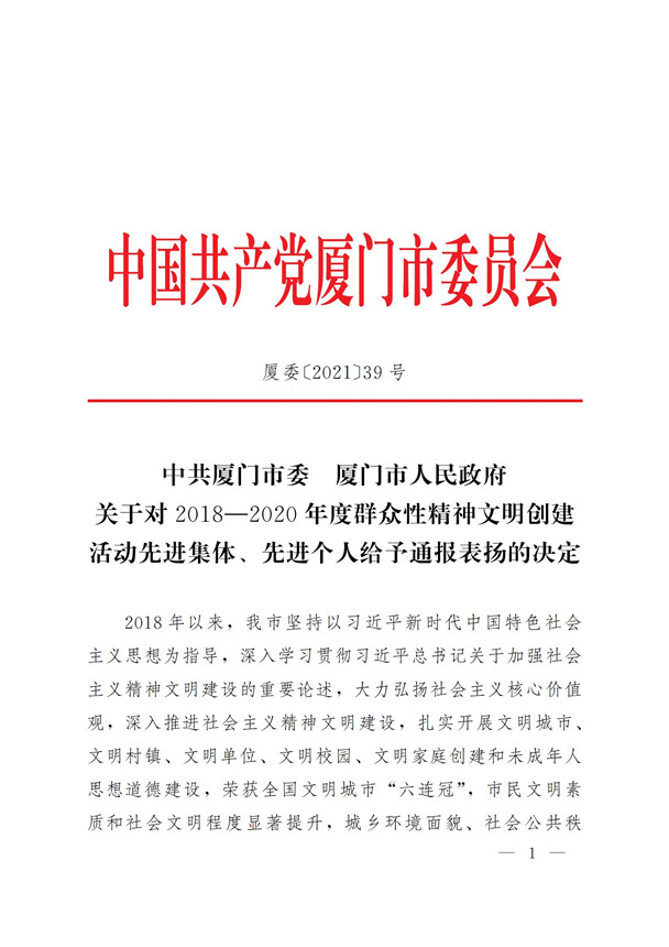 荣获2018-2020年度群众性精神文明创建活动先进集体、先进个人通报表扬