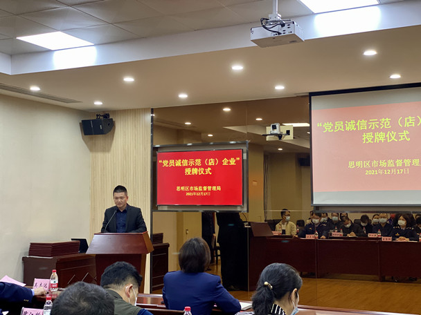 12月17日,党支部书记朱小波参加了由思明区市场监督管理局举办的“党员诚信示范企业”授牌仪式,并作为企业代表在会上做了分享。