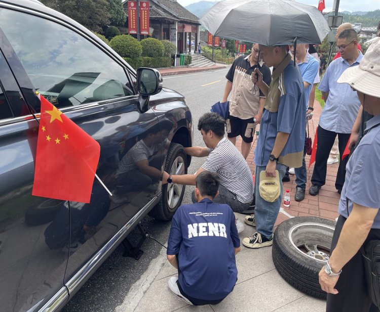 2023年8月10日,鹭达公司员工在团建的路上偶遇一对70岁高龄从上海来闽自驾游的夫妇,因车辆爆胎焦急的在路上寻求救援。