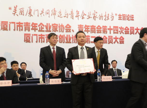 1月25日下午,“美丽厦门共同缔造与青年企业家的担当”主旨论坛暨厦门市青年企业家协会、青年商会第十四次会员大会和厦门市青年创业协会第二次会员大会在厦门国际会议中心隆重举行。会议选举产生了青企协、青商会和青创会新“掌舵者”,其中,鹭达眼镜董事长张和辉当选为青年创业协会荣誉会长。会上,张和辉还被聘任为厦门市青年创业导师。