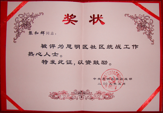 在思明区统战宣传月启动仪式上张董被评为思明区统战工作热心人士
