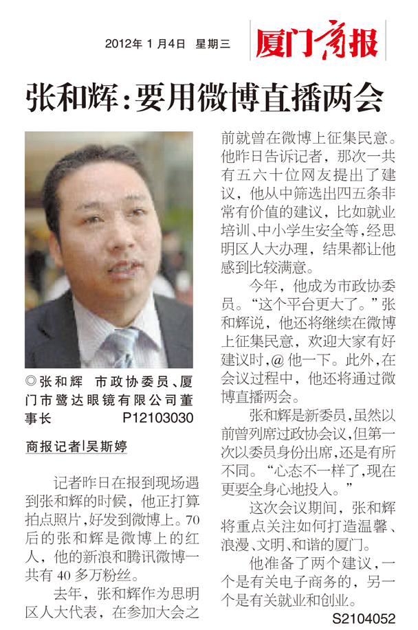 中国人民政治协商会议第十二届厦门市委员会第一次会议于2012年1月4日至8日举行,鹭达眼镜董事长张和辉作为厦门市政协委员参加了此次会议。张和辉是微博红人,他的新浪和腾讯微博粉丝量达40多万,在整个会议过程中,他通过微博直播两会并广泛征集民意,提出了两个议案,一个是如何更好更快地发展电子商务,另一个是政府如何引导青年创业和就业。